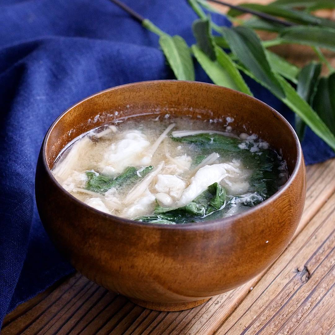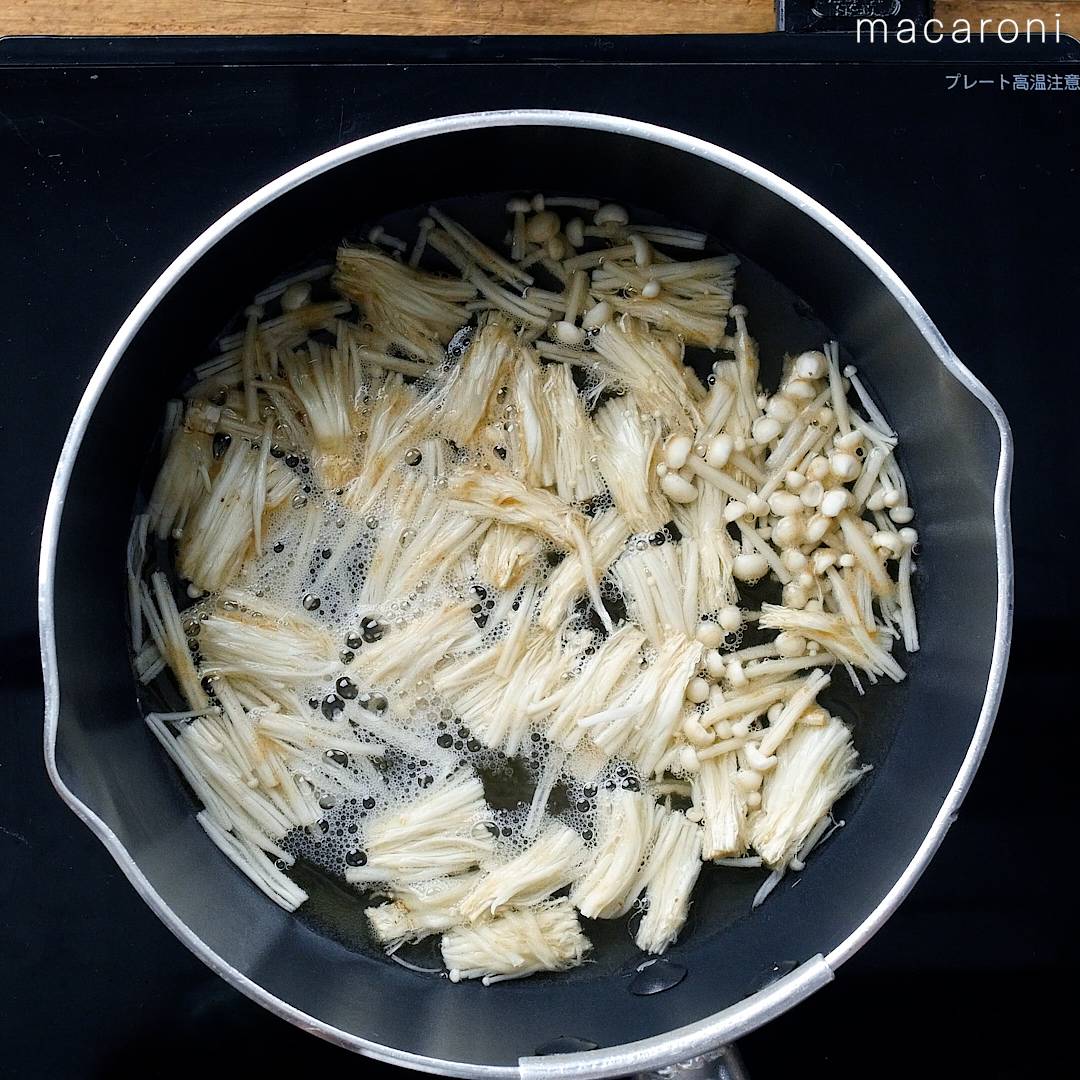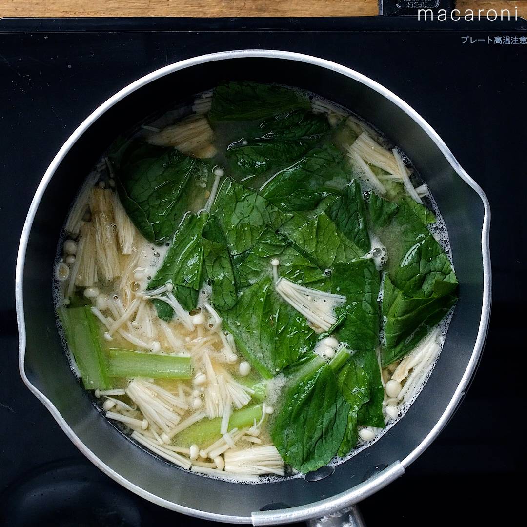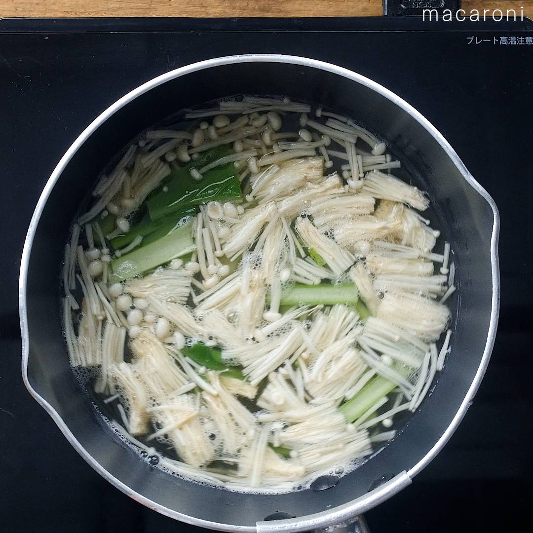 1: 鍋に水・だしの素・えのきを入れて中火に熱し、ひと煮立ちさせます。