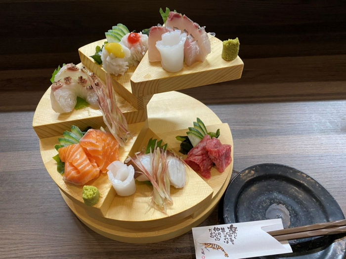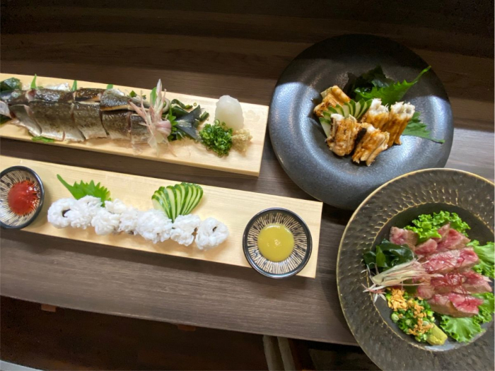 写真映え間違いなしの「大将おすすめ刺身盛合せ」。見た目のインパクトも驚きますが、新鮮なお刺身のその味にもびっくり。