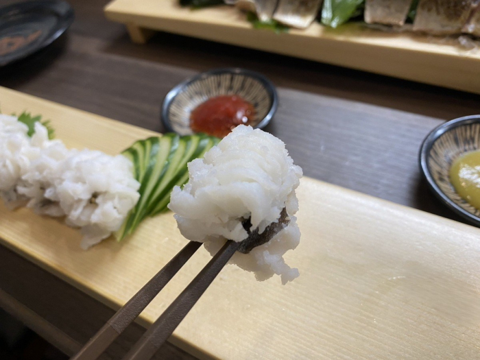 この白さが美しい……。舌の上にのせるとやわらかく、それでいて食べごたえのあるハモです。