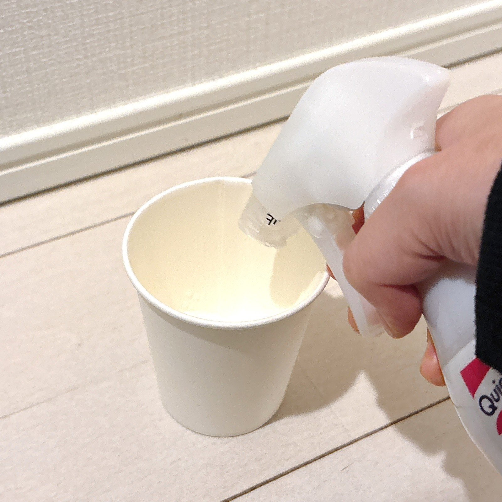 手順1.紙コップにクイックル ホームリセットをスプレーします