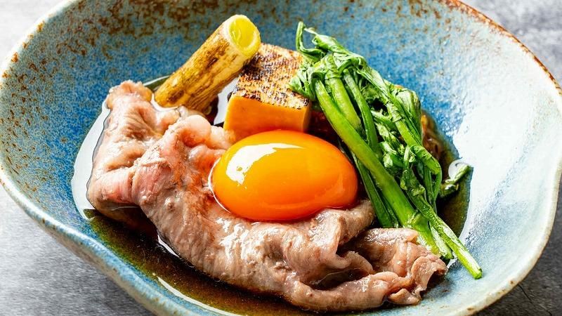 そして「関西といえば」なお料理を、北海道産の食材で提供する…こちらは看板メニューのひとつ、黒毛和牛の炙りすき焼き。卵は江別・太田ファームのファフィ卵。