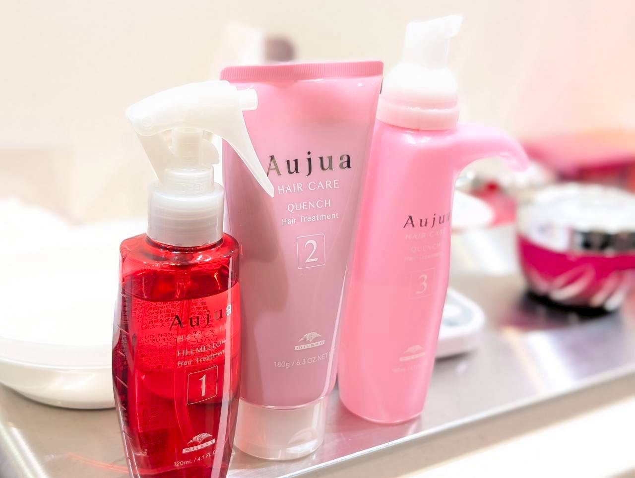 美容師さんに相談したところ、「Aujuaトリートメントのクエンチ」は、髪の乾燥を抑え、うるおいに満ちた髪へ導いてくれるとのこと。