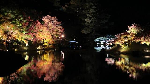 鷺池に浮かぶ小さな東屋と池のほとりで色づく紅葉の取り合わせは、まるで絵巻物の世界。水面に映る紅葉もまた美しい。さらに日が暮れて浮見堂がライトアップされるとぐっと幽玄な趣となるので、夜の紅葉も楽しみたい。