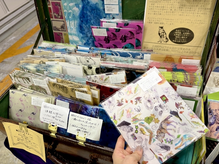 危うく文字に遭難しかけたところを、救い上げてくれたのは壁際のブースで見つけた色彩だった。「made blue」では小説のほか、画集やアートポスターなどを販売しており、中でもトランクいっぱいのカラフルなブックカバーが心に響いた。大の読書好きという作家さん曰く、自分の手汗で本が傷んでしまわないように、水に強い蝋引き加工紙のブックカバーを製作するようになったのだという。独特の色遣いは、自身の共感覚に基づいているのだとも語ってくれた。ちなみに、さまざまな動物柄があるブックカバーの中の人気どころを尋ねてみると「(文学フリマでは)なぜかキーウィが好きな方が多いみたいで、たくさん持ってきたのに残り少なくなりましたね(笑)」とのこと。それは絶滅動物のキーウィに文学を感じる人が多いから……なのかもしれない。