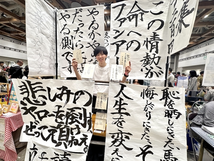 ホール内をさまよう中で、明らかに異彩を放っているブースを発見したので現場に急行。筆文字の詩で四方を囲んだ設えは、会場でも1、2を争う目立ちぶりである。一体どんな人が売っているのかヒヤヒヤしながら近寄ると、書の合間からひょっこり顔を出したのは意外なほど人懐こく、圧強めの表現とはいい意味でギャップを感じる作家さんだった。