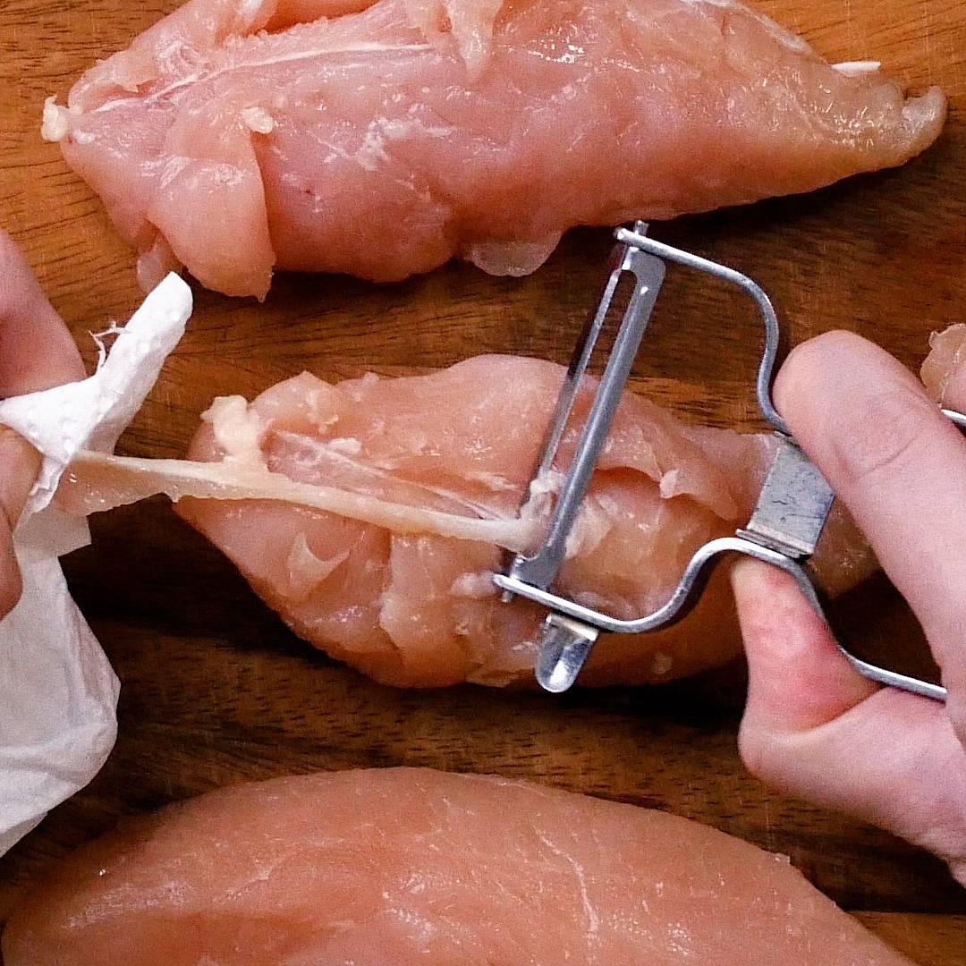1: 鶏ささみはピーラーの隙間に筋を通し、キッチンペーパーで筋の先をしっかりと掴んで反対方向にピーラーを動かして取り除きます。