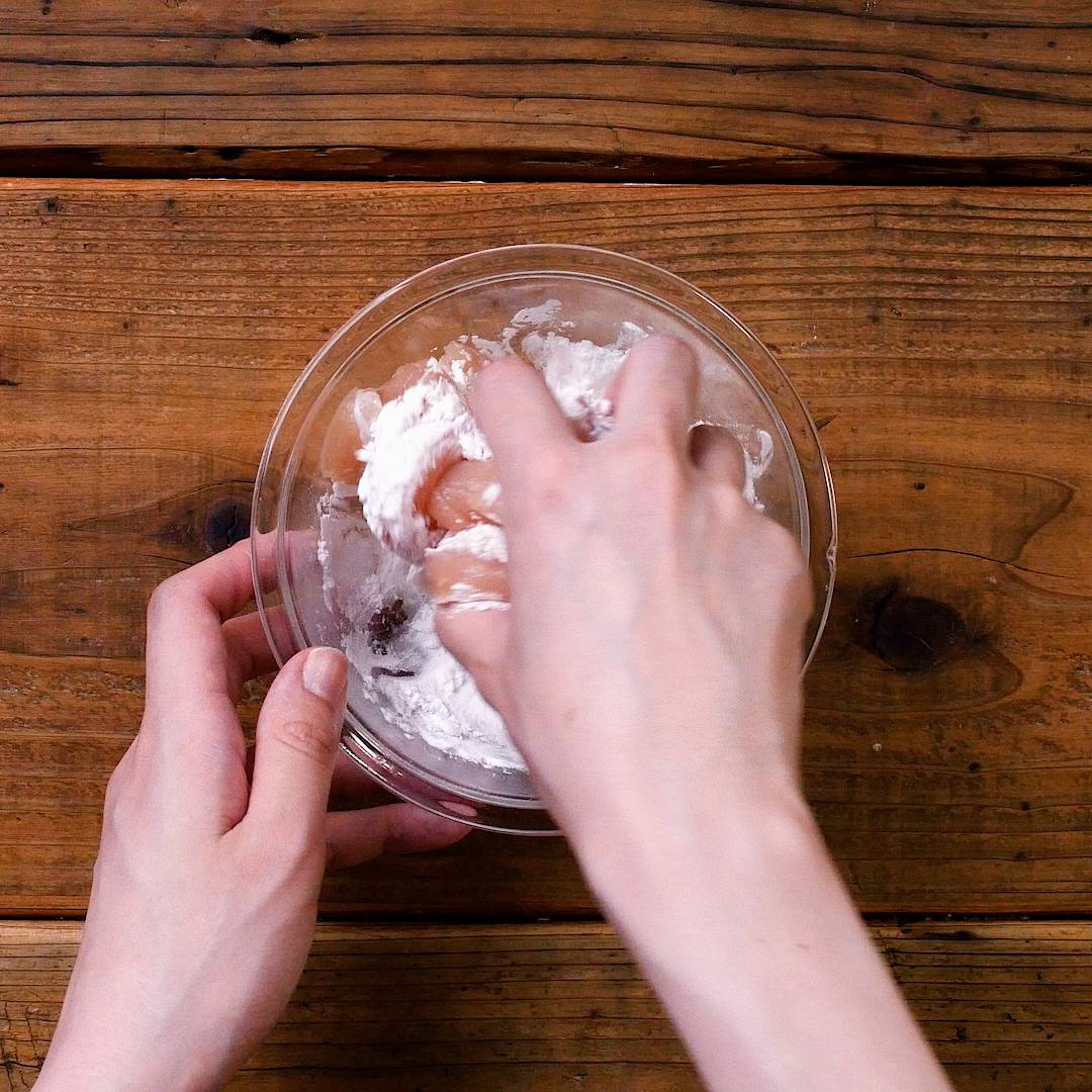 3: 酒、味付塩こしょうで下味をつけ、片栗粉をまぶします。