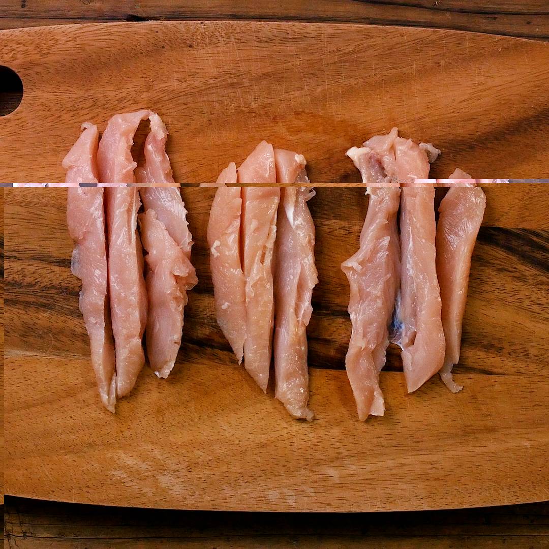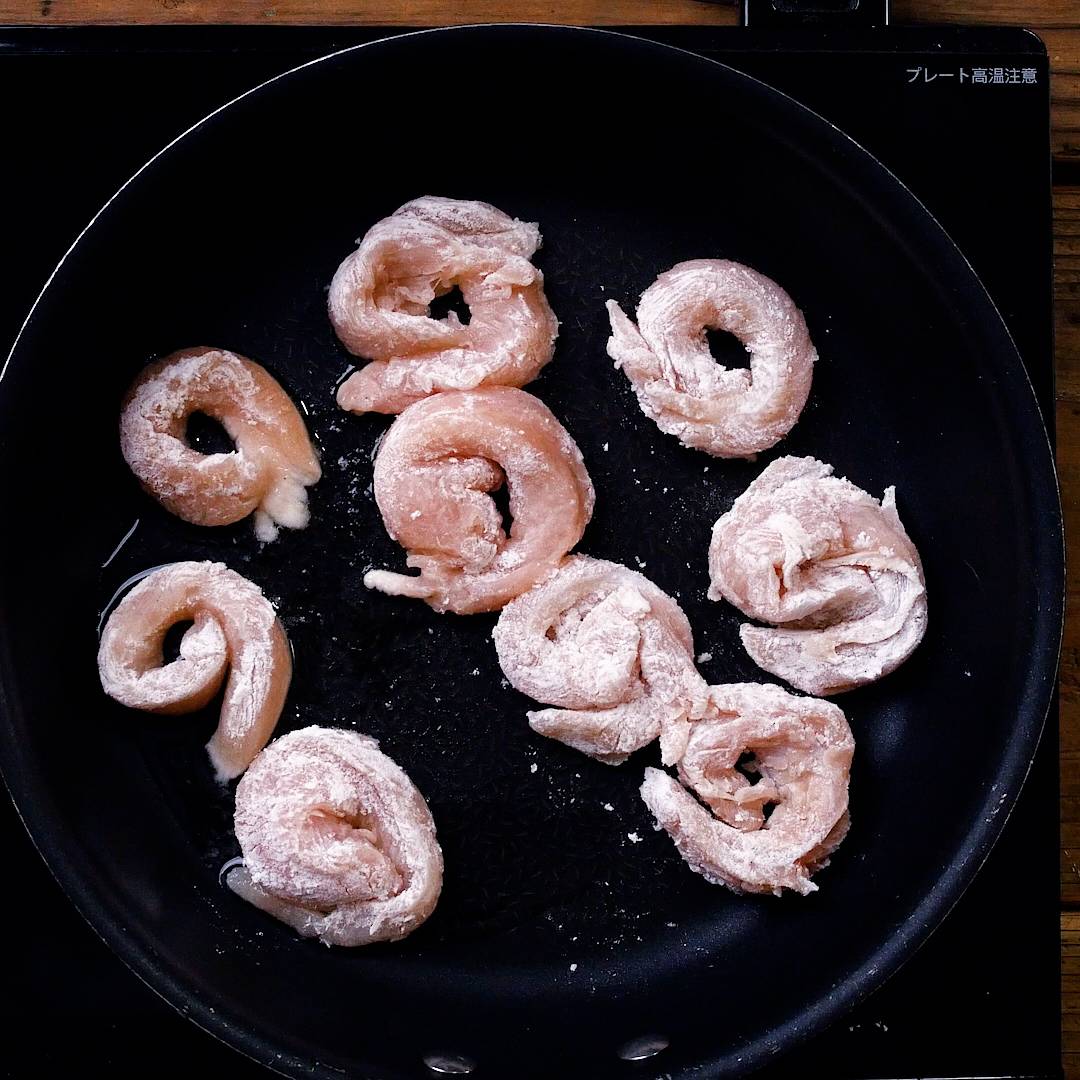 フライパンにささみを置くときは丸くなるように形を整えてください。