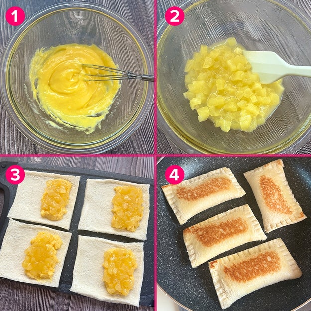 ③ 食パンの耳を切り落とし、麺棒で平らに伸ばす。①と②を1/4量ずつのせて半分に折りたたみ、フォークで縁をしっかり閉じる。同様にあと3個作る。