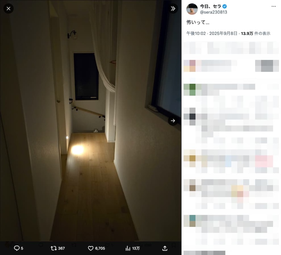 このほど飼い主さんがXに「怖いって」というコメントともに投稿したのは、消灯した自宅廊下を写した1枚。