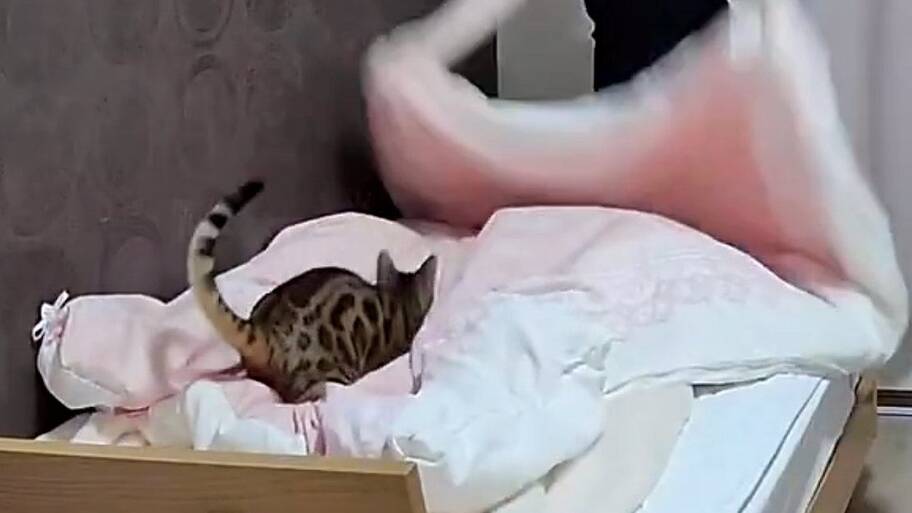 ベッドでくつろぐ猫に『床ドン』してみた結果…想像以上に『ヒロインすぎる反応』が179万再生「キスした後余計にw」「ドラマみたいだw」