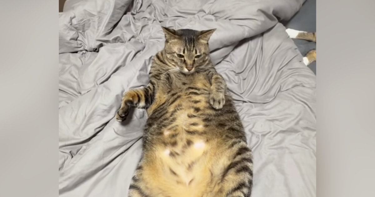 この日は飼い主さんのベッドの上で仰向け状態でどっしりくつろいでいたというぱす太くん。でっぷりとしたお腹が貫禄たっぷり!
