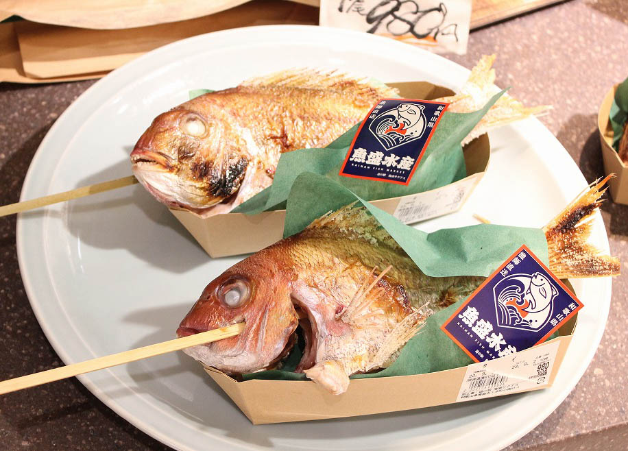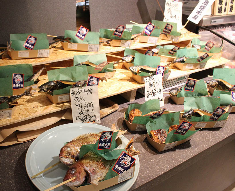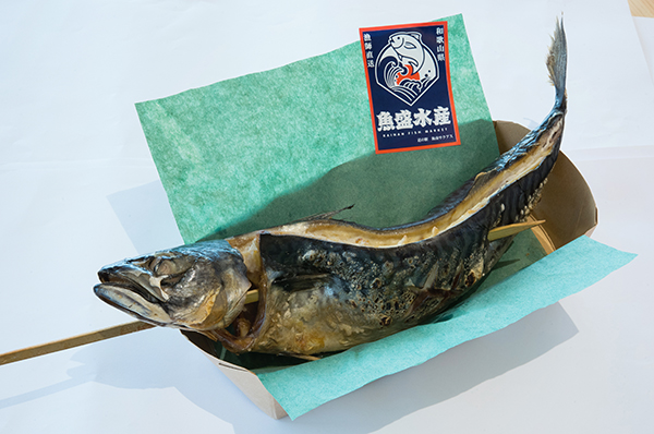 海鮮で作られた寿司や干物などが販売されます。竹串で魚一匹を刺して丸ごと焼いた「浜焼き」を豪快にいただきましょう!