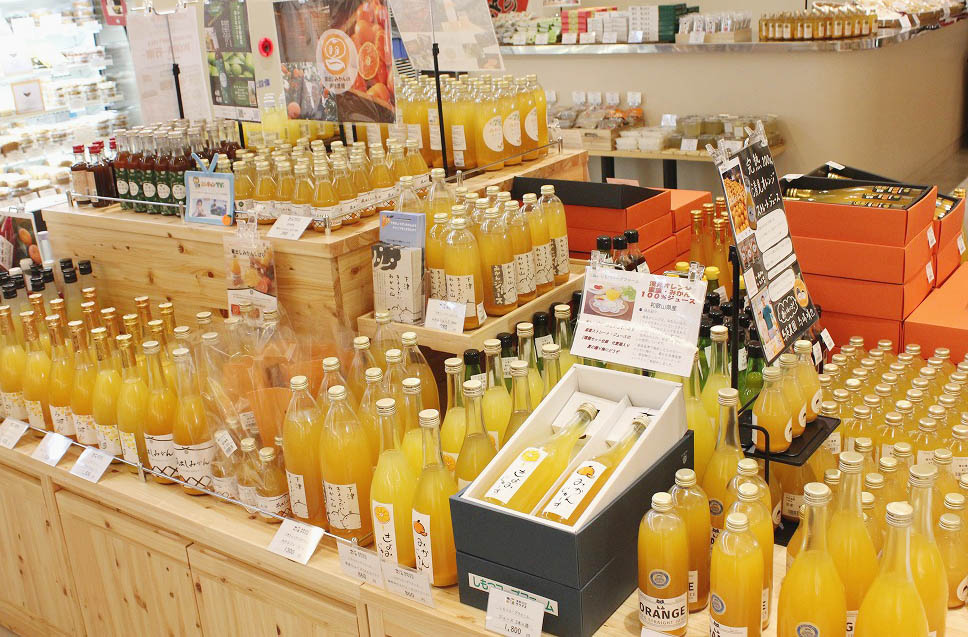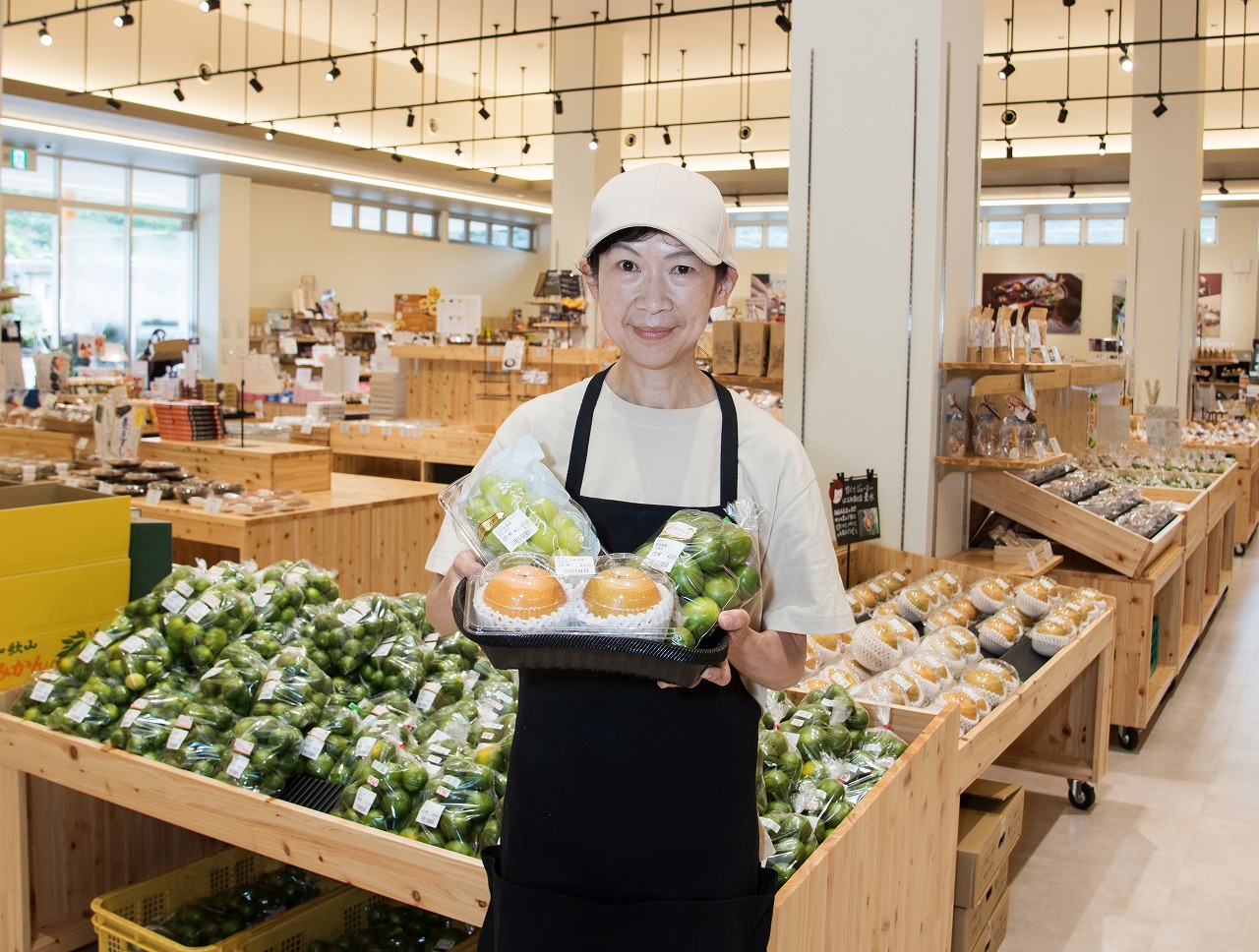 物産交流館内の産直マルシェは、ミカンをはじめ、地元で収穫されたばかりの果物や野菜、牛乳に卵などの特産品が並ぶマーケットです。四季折々の果物は種類が豊富で、あれもこれも買いたくなること間違いなし。