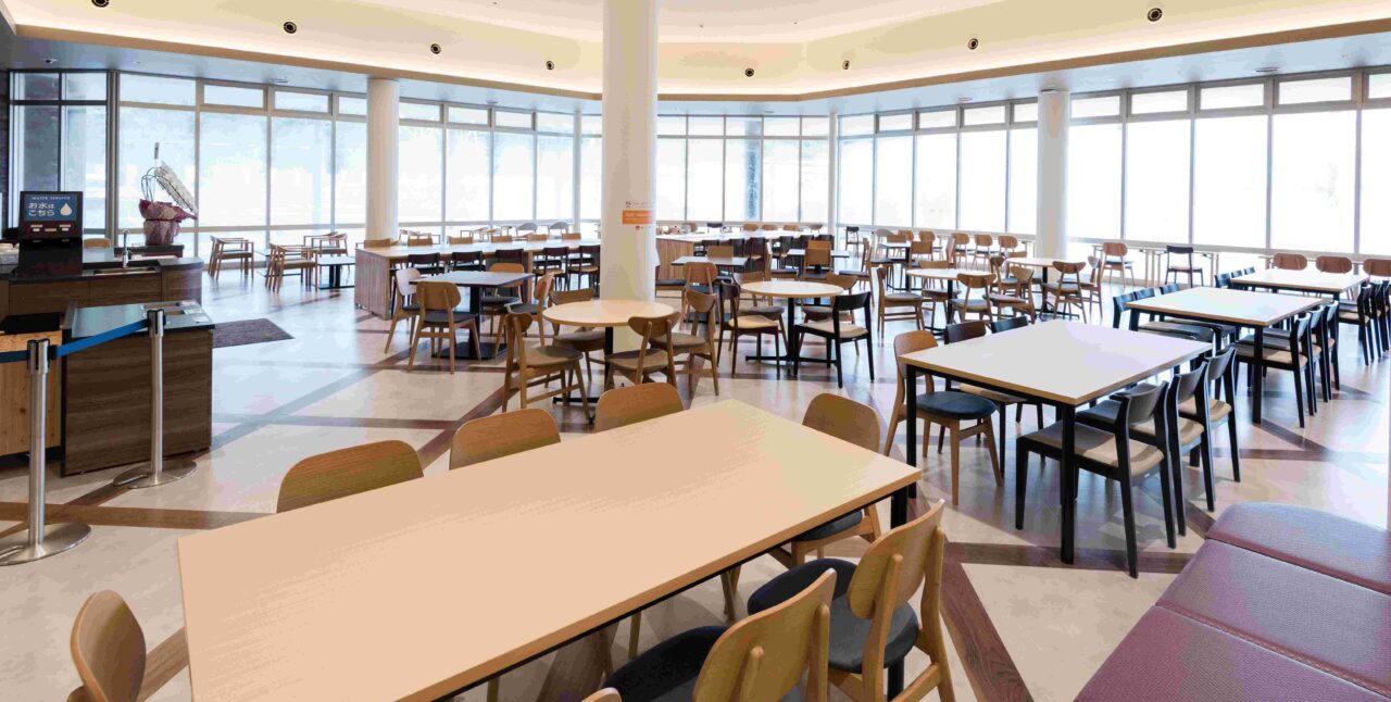 物産交流館のエントランス近くには、魚盛水産の定食やSHIMOTSU FRUITSのスイーツをゆったり座って味わえる「イートインスペース」(約90席)があります。食事をするだけでなく、地域の人たちが集まる憩いの場にもなっています。
