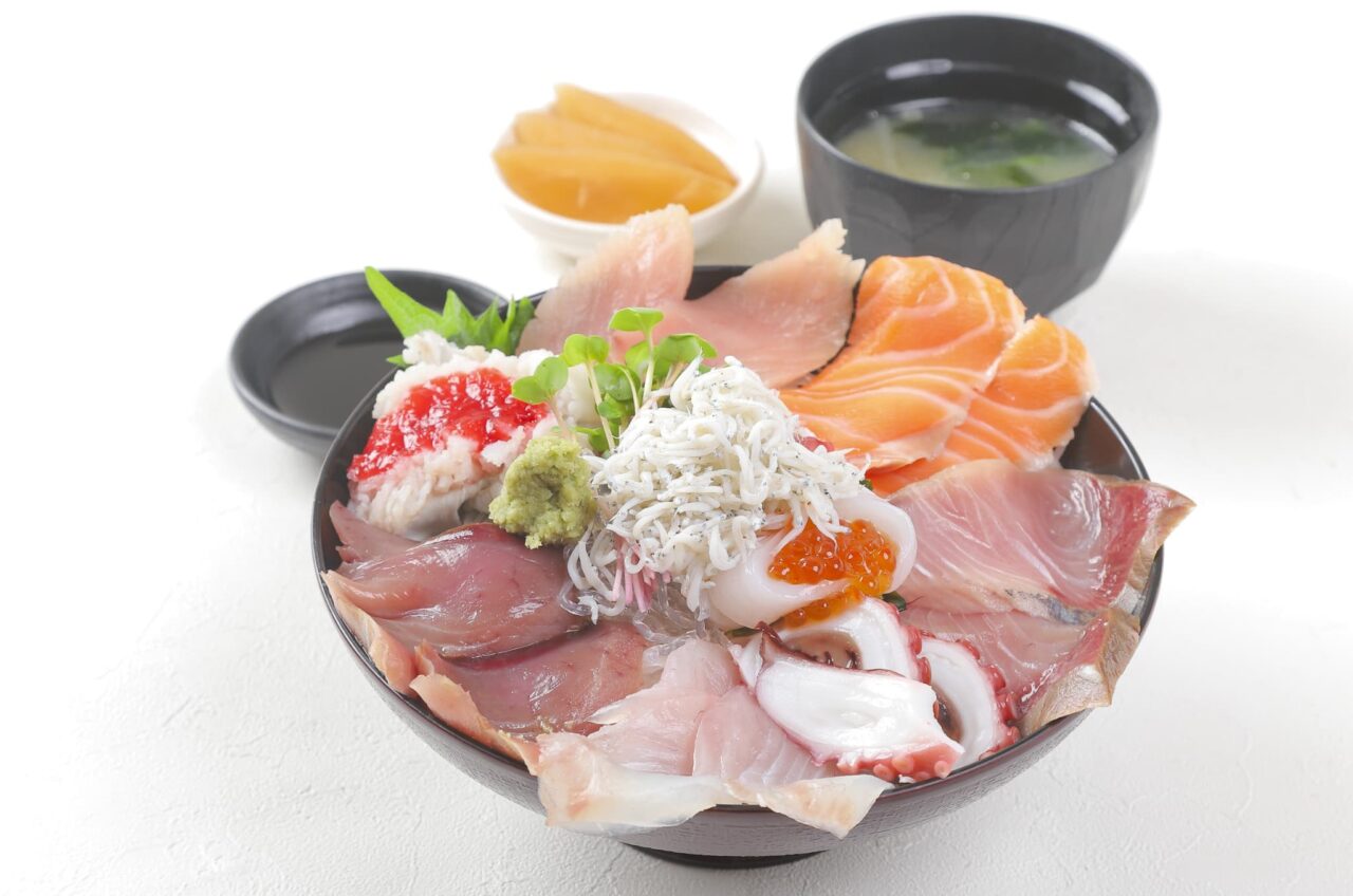 鮮魚売り場の横は飲食コーナー。新鮮な魚介を刺し身にして定食や丼ものなどにして提供しています。大エビフライやアジフライ、唐揚げ定食、うどんなどもあり、和歌山の“旬”を存分に堪能しましょう。