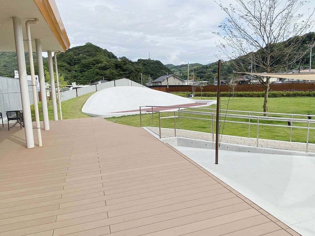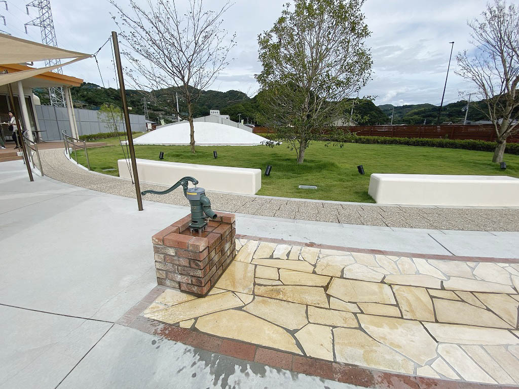 物産交流館には「かもしばテラス」を併設。テラス席や緑が心地よい芝生広場が広がります。白い大きな山は滑り台になっていて、子どもたちが喜びそう! このスペースは壁で駐車場と区切られ、車の出入りを気にすることなく、子どもたちが遊んだり、大人もベンチに座ってくつろげるようになっています。ポンプ式の井戸で水遊びも! 今の子どもたちには、きっと新鮮ですね。