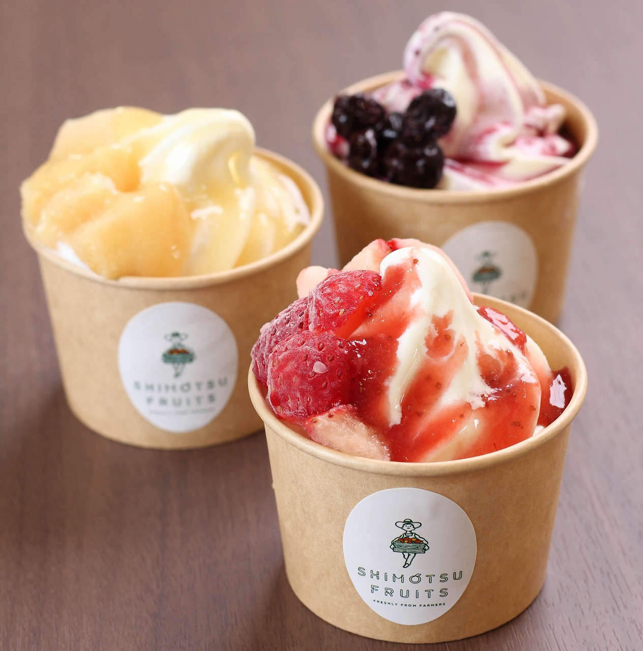 物産交流館内にある「SHIMOTSU FRUITS(フルーツ)」は、フルーツ王国・和歌山のバラエティー豊かな季節の果物と、黒沢牧場の濃厚ソフトクリームを使って手作りされたスイーツがそろうフルーツパーラー。