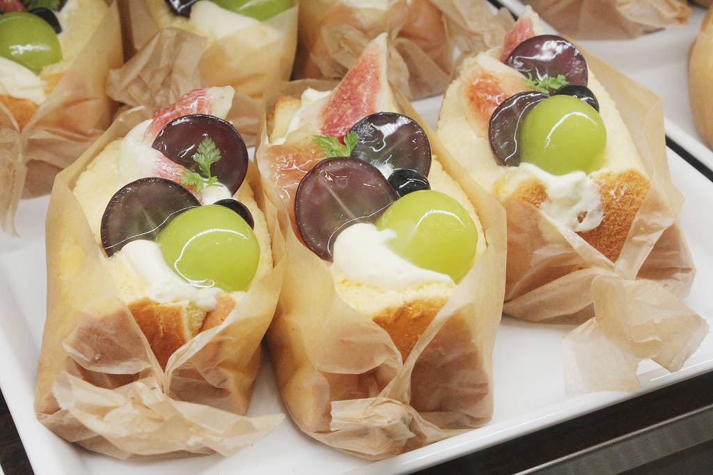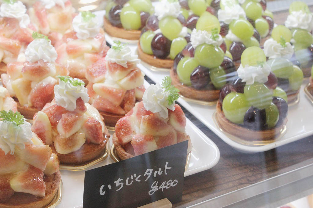 タルトやシフォン、カップ入りの持ち帰り用パフェなどがショーケースに並んでいます。フルーツたっぷりの写真映えスイーツは、さっそく人気を集めています。