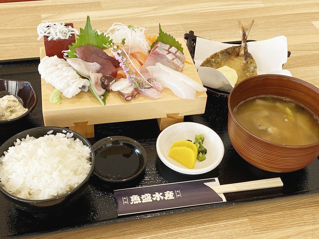 物産交流館内の「魚盛水産」は、県内で水揚げされたばかりの新鮮魚介を買うことができる「鮮魚コーナー」と、それらの魚を素材にした料理を提供する「飲食コーナー」があります。
