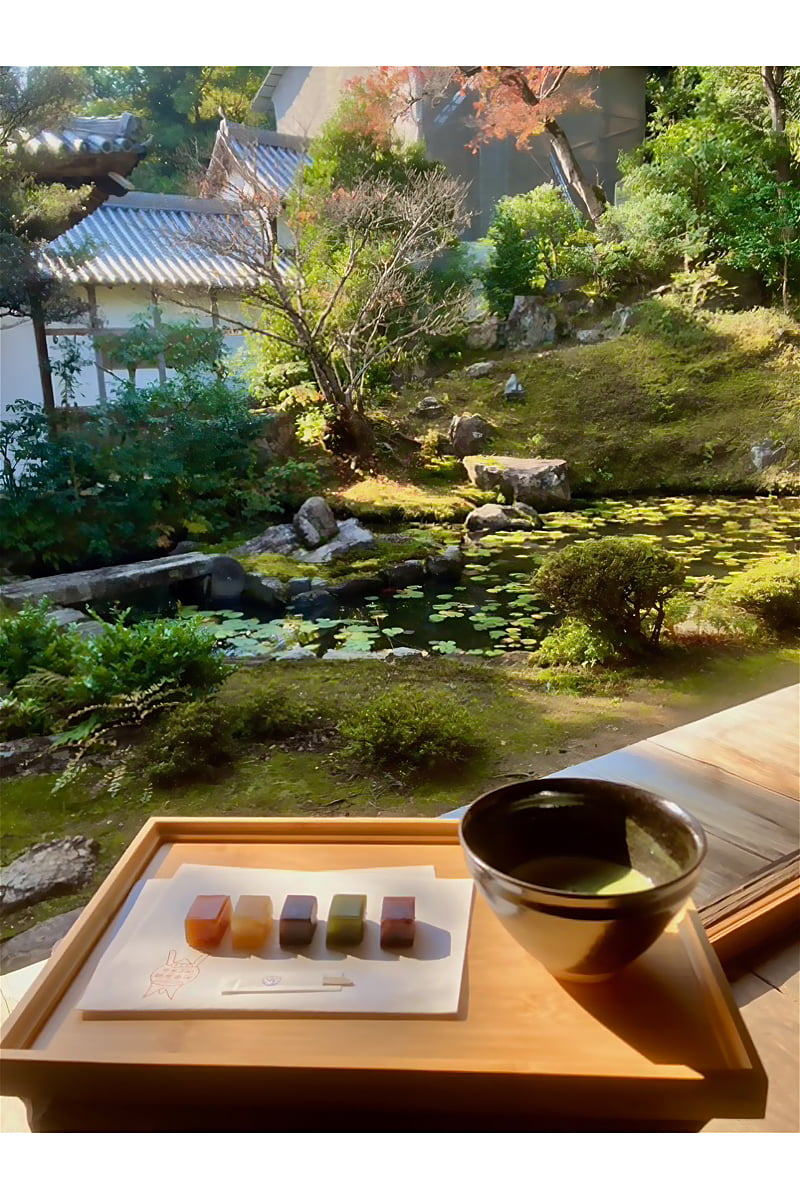 「秋の特別公開」中の土日限定で、「鶴屋吉信」謹製の小型羊羹「鶴屋吉信ようかん」5種類が食べ比べられる特別メニューが登場。特別公開される「方丈」から晩秋の庭園を眺めつつ、あたたかい抹茶とおいしい羊羹を楽しめる、幸せな時間が過ごせます♪