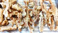 冷凍したイカ団子を油で揚げています。団子自体はすでに火が通っていますので、キツネ色になれば出来上がりです