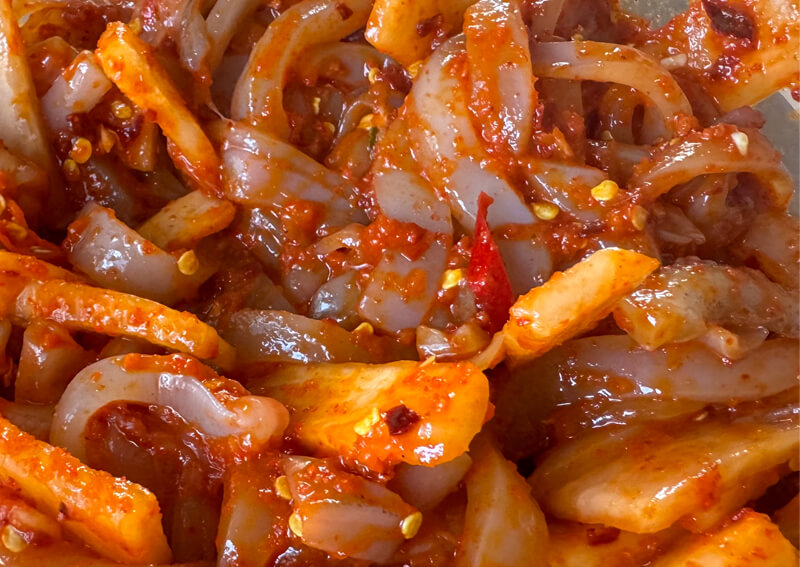 コツは混ぜ合わせたあとで味を調整すること。毎日かき混ぜてください。唐辛子粉(粗挽き)は辛味が強く、細挽きは辛味よりも色味のために使います。辛味の調整は粗挽きの唐辛子粉で調整するとよいでしょう。ダイコンが馴染んで柔らかくなった頃合いが食べごろです。