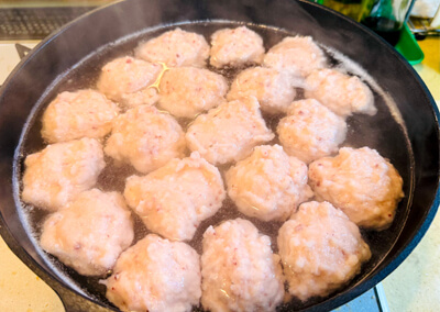 ペーストを丸めて団子にして茹でているところです。わが家ではたくさん作り置きして冷凍保存しています