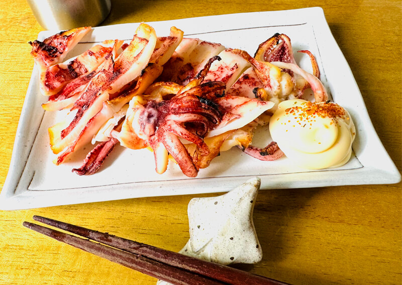 さて、スルメイカの定番料理といえば「一夜干し」。軽く炙って七味とマヨネーズでいただけば、ビールが進む一品になります。