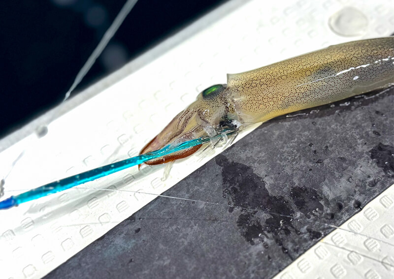 30分ほどでポイントに到着し実釣開始。スタートこそ無反応の時間もありましたが、集魚灯が点灯する時間帯になると、徐々にイカの寄り付きも感じられるようになりました。竿先を鋭く弾くようなスルメイカのアタリと、モゾモゾと繊細なアタリのヤリイカが混在しているようです。