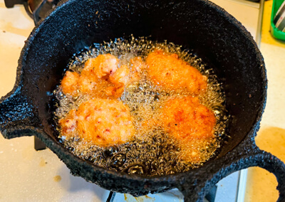 ⑥150℃の油で茹でた団子を、そのまま表面がキツネ色になるまで揚げます