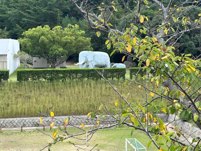 せっかくなので、徒歩で行ってみることにした。途中にはサッカー場があり、象のような不思議なアート作品が置いてあったり……