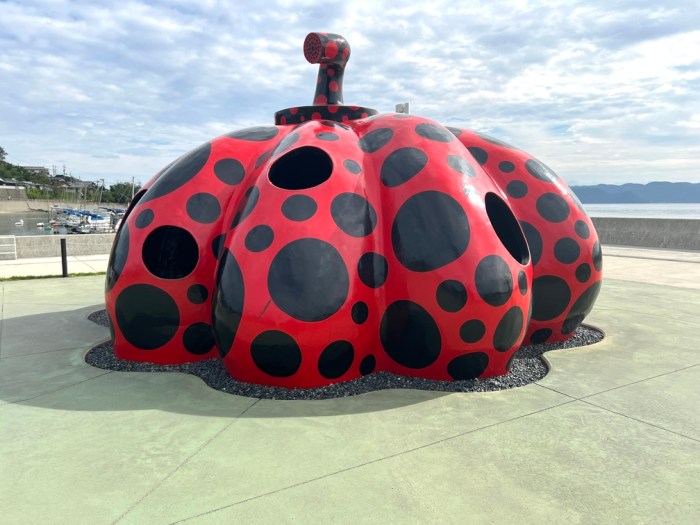 こちらは本村港とは規模も違い、便の数も格段に多い。そして、ここにも数々のアート作品が屋外に点在していた。日本を代表する芸術家の草間彌生氏が手がけた作品「赤カボチャ」をはじめ、世界的なアーティストが手がけたオブジェが点在している。