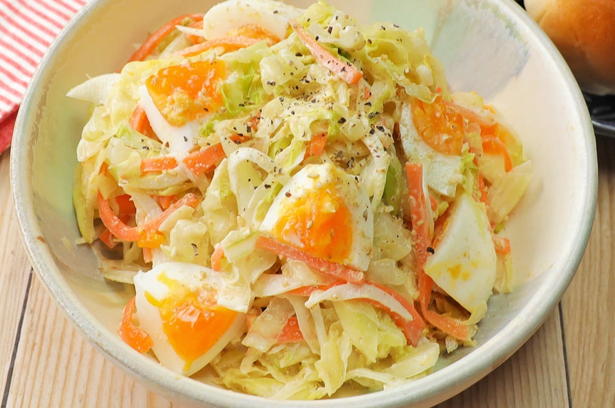 キャベツを塩もみして、ゆで卵とごまマヨで和えるだけ!パパッと作れる「キャベツとゆで卵の和風ごまマヨサラダ」のレシピをご紹介します。