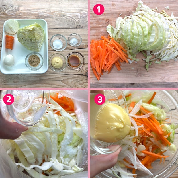 ① キャベツは5mm幅に切り、にんじんは皮をむいて千切りにする。