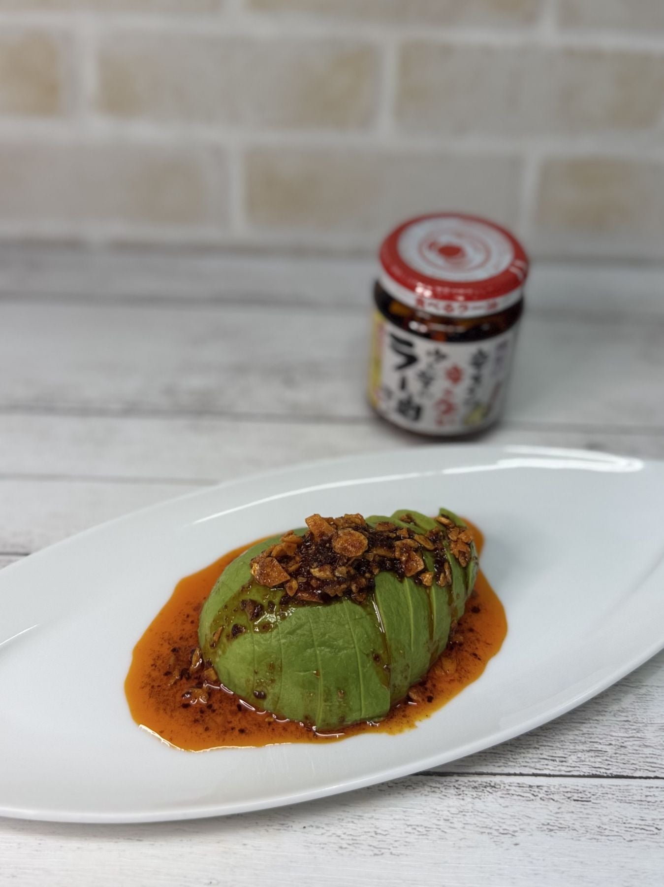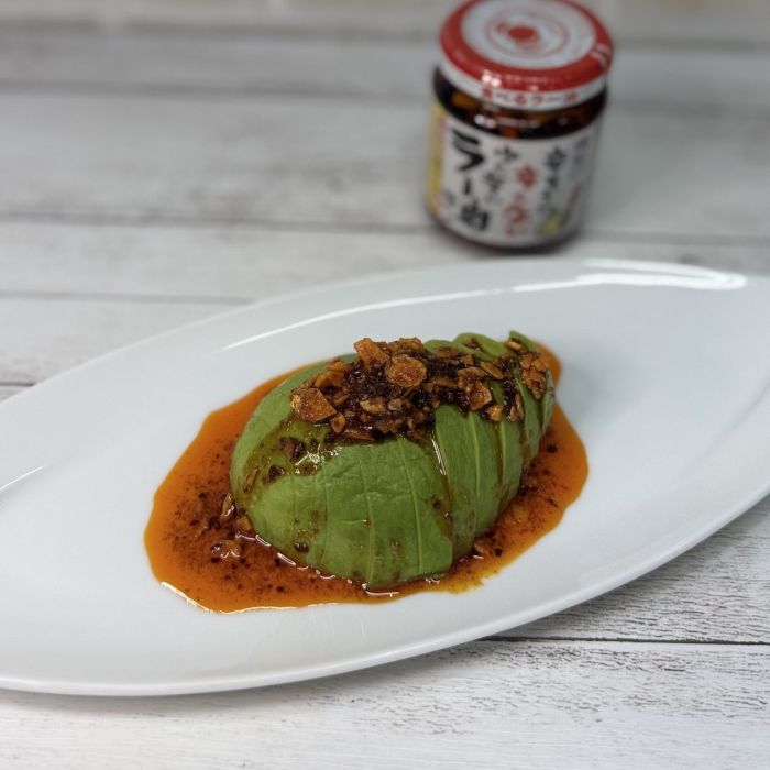 桃屋の「食べるラー油」 かけるだけで簡単おつまみ!アボカドのラー油がけ