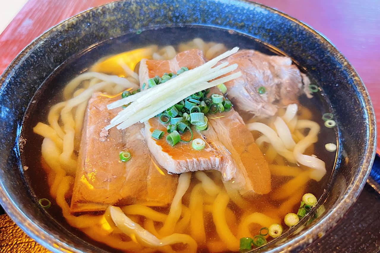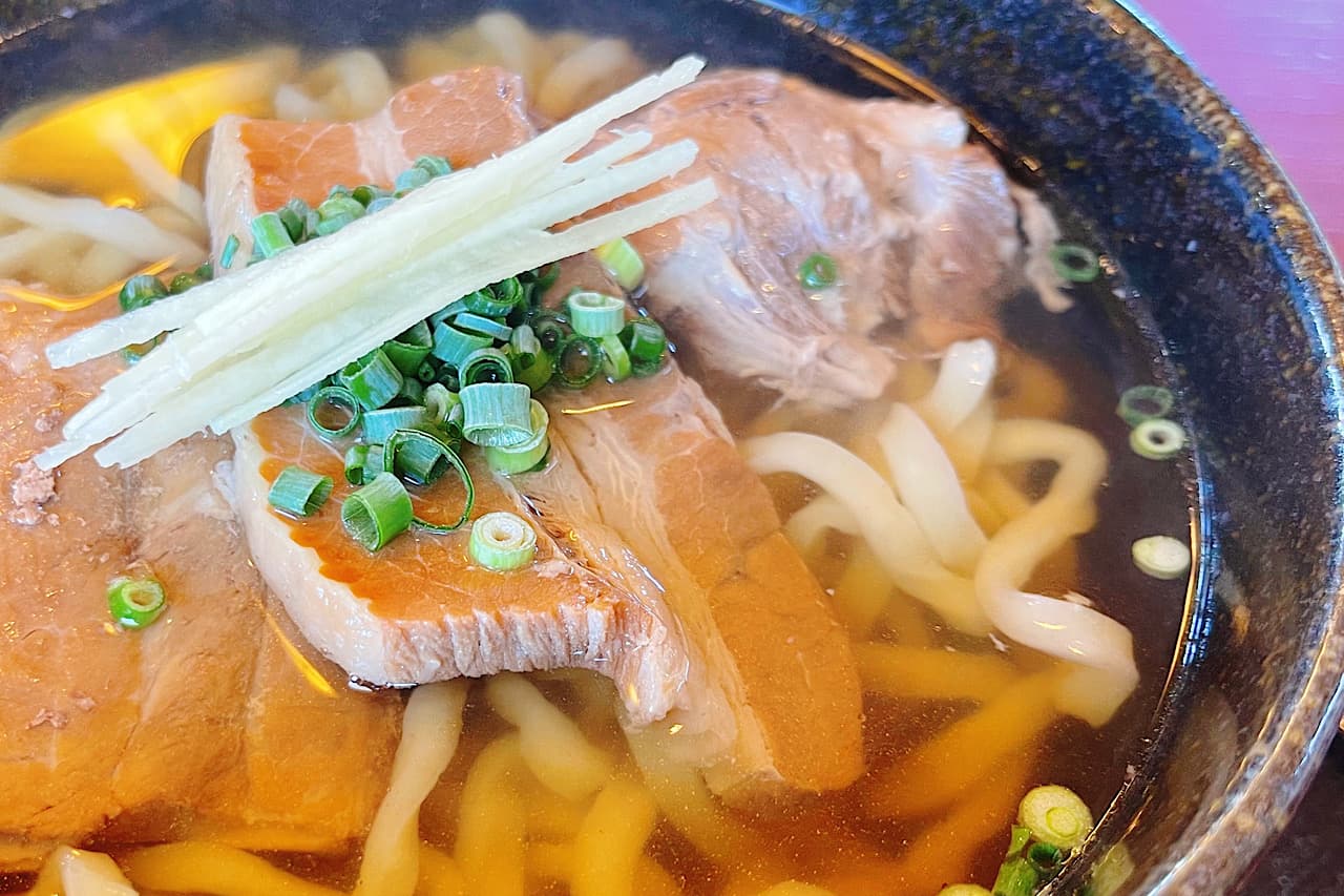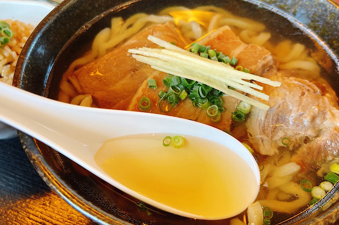 「ちょーでーぐぁすば」には、三枚肉・本ソーキ・なんこつソーキと、3種類のお肉が贅沢にトッピングされています。 ていねいに下処理をして煮込まれたお肉は、味付けは控えめですがほろりとほどけるやさしい口あたりで、口のなかでじわっと旨みが広がります。ピリッと味を引き締めてくれる針生姜も、よいアクセントです。
