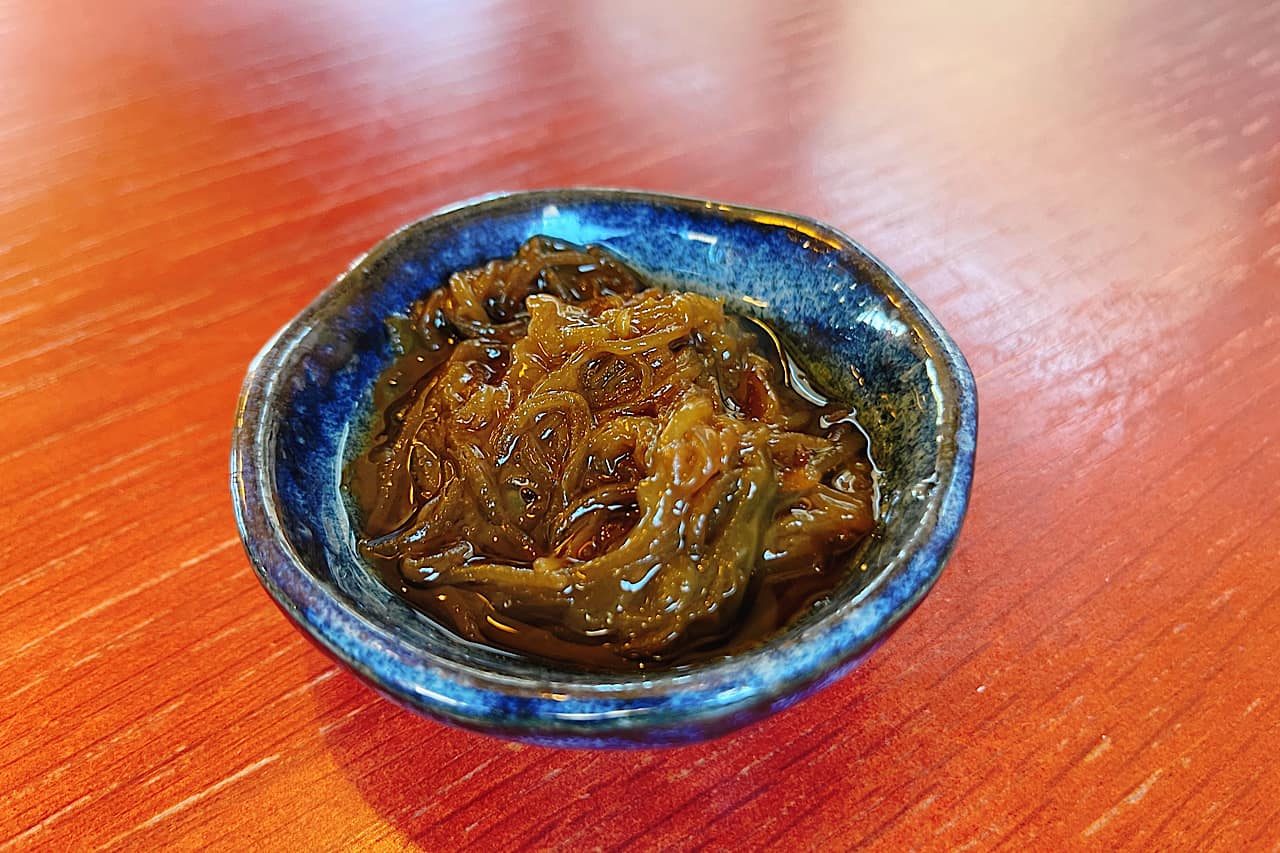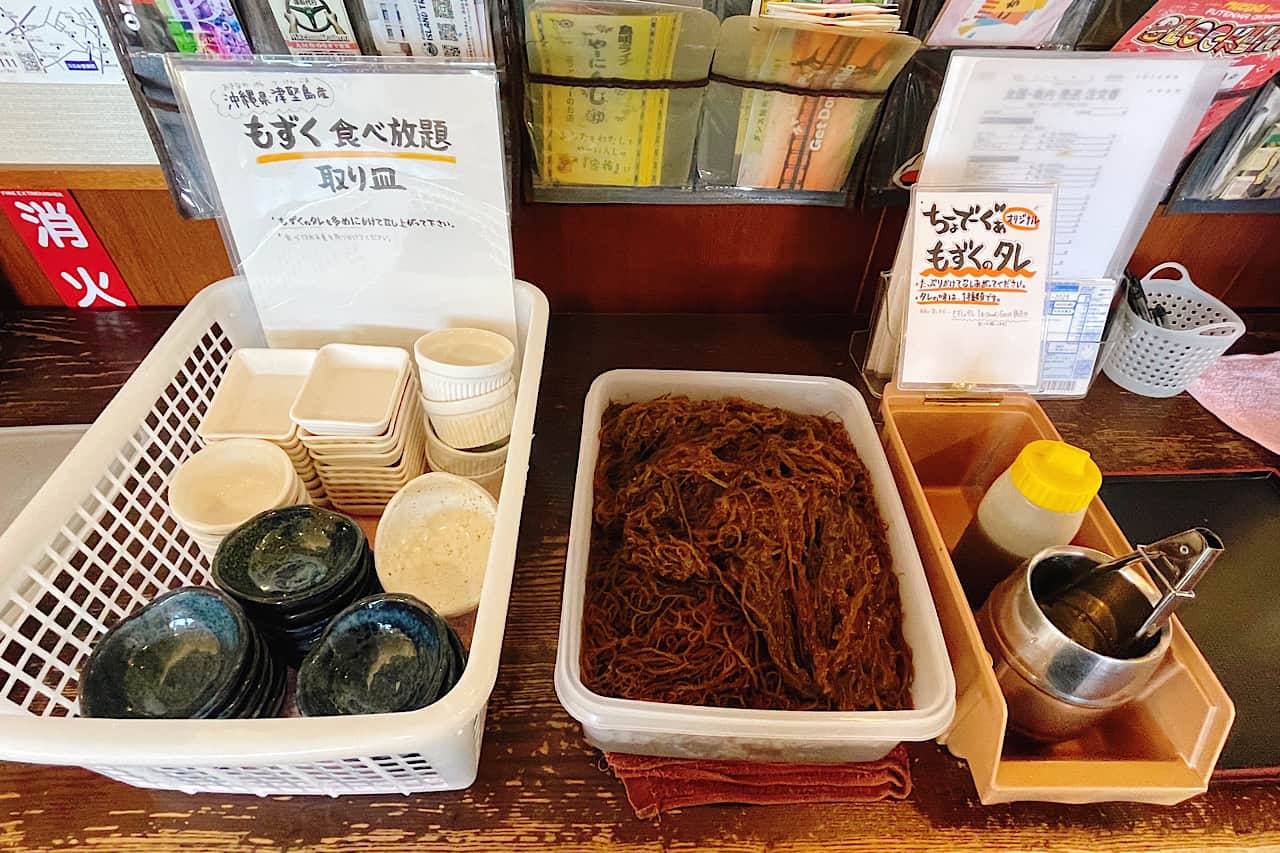 「ちょーでーぐぁ」では生麺を茹でるため、混み合う時間は少し待つ場合があるそう。そこで待ち時間も楽しめるようにと、「もずくの無料サービス」が提供されています。 自家製のタレで和えたもずくは、つるんとさっぱりした味わいで、もずくをめあてに訪れているお客さんもいるほど。 待つ時間がおいしい時間に変わる、うれしいサービスです。