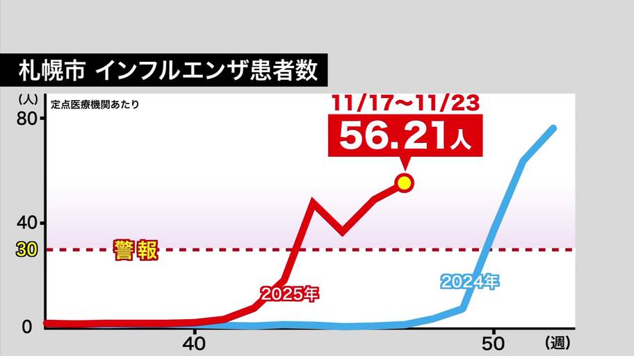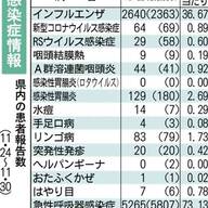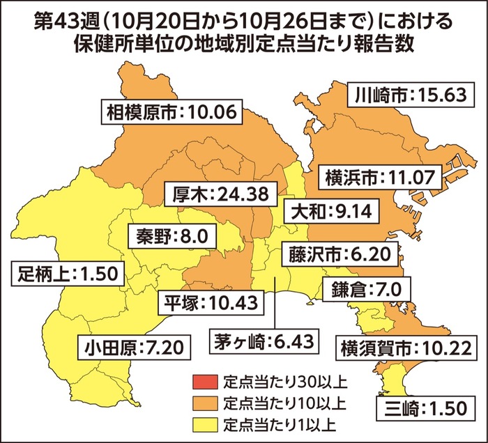 神奈川県では、県内のインフルエンザの定点当たり報告数が第43週(10月20日〜26日)に「11・88」となり、流行注意報の基準である「10・0」を超えた。
