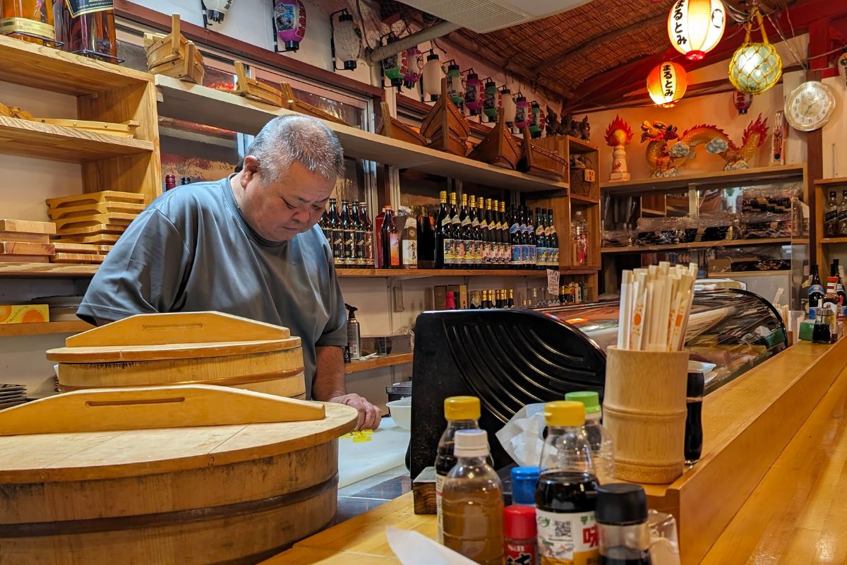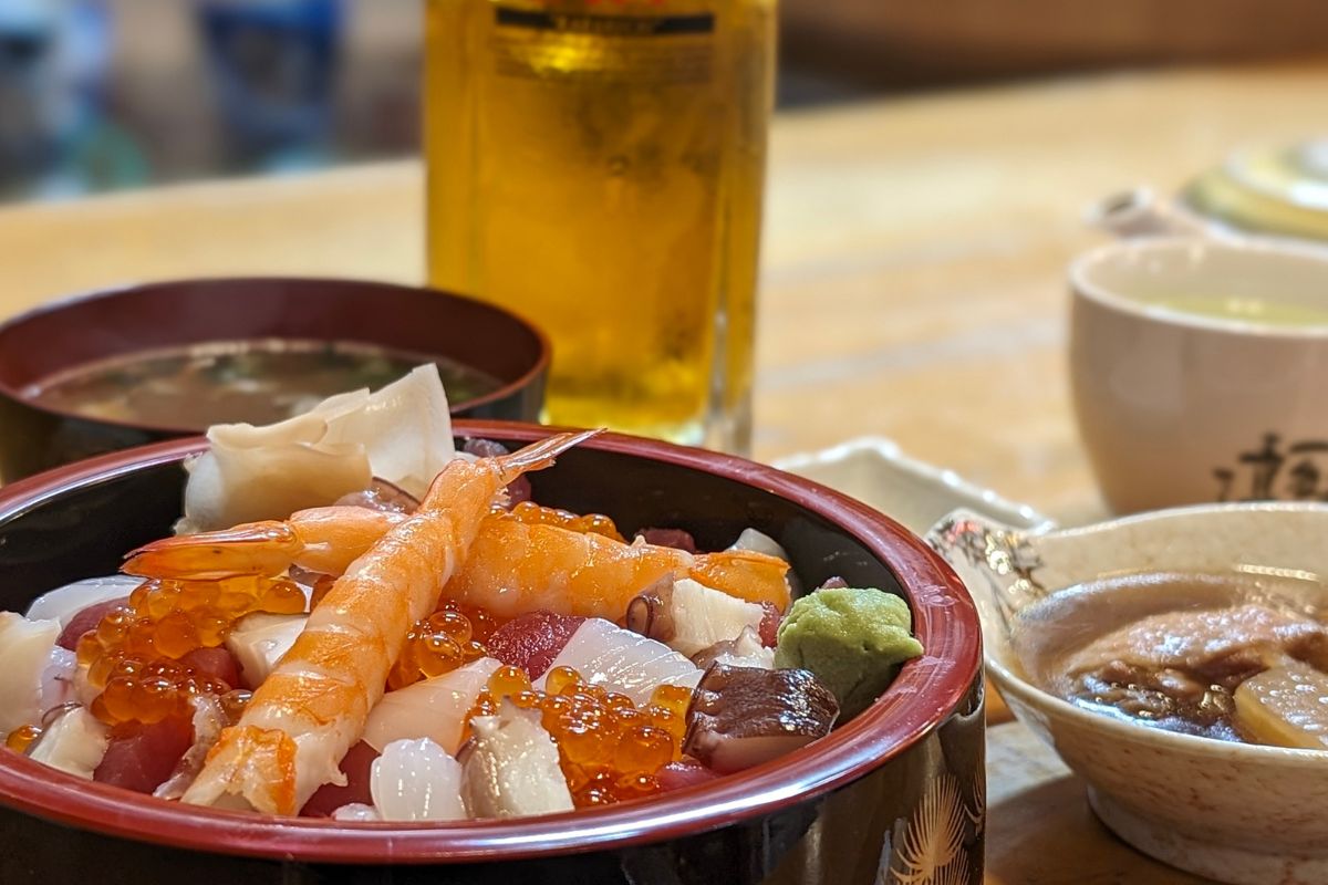 居酒屋なので「尚円の里」「伊是名島」など、島ならではの泡盛もあり、充実しています。 メニューは、お寿司と沖縄料理。ちらし寿司をご飯少な目でお願いしました。イクラも載った豪華版が登場。