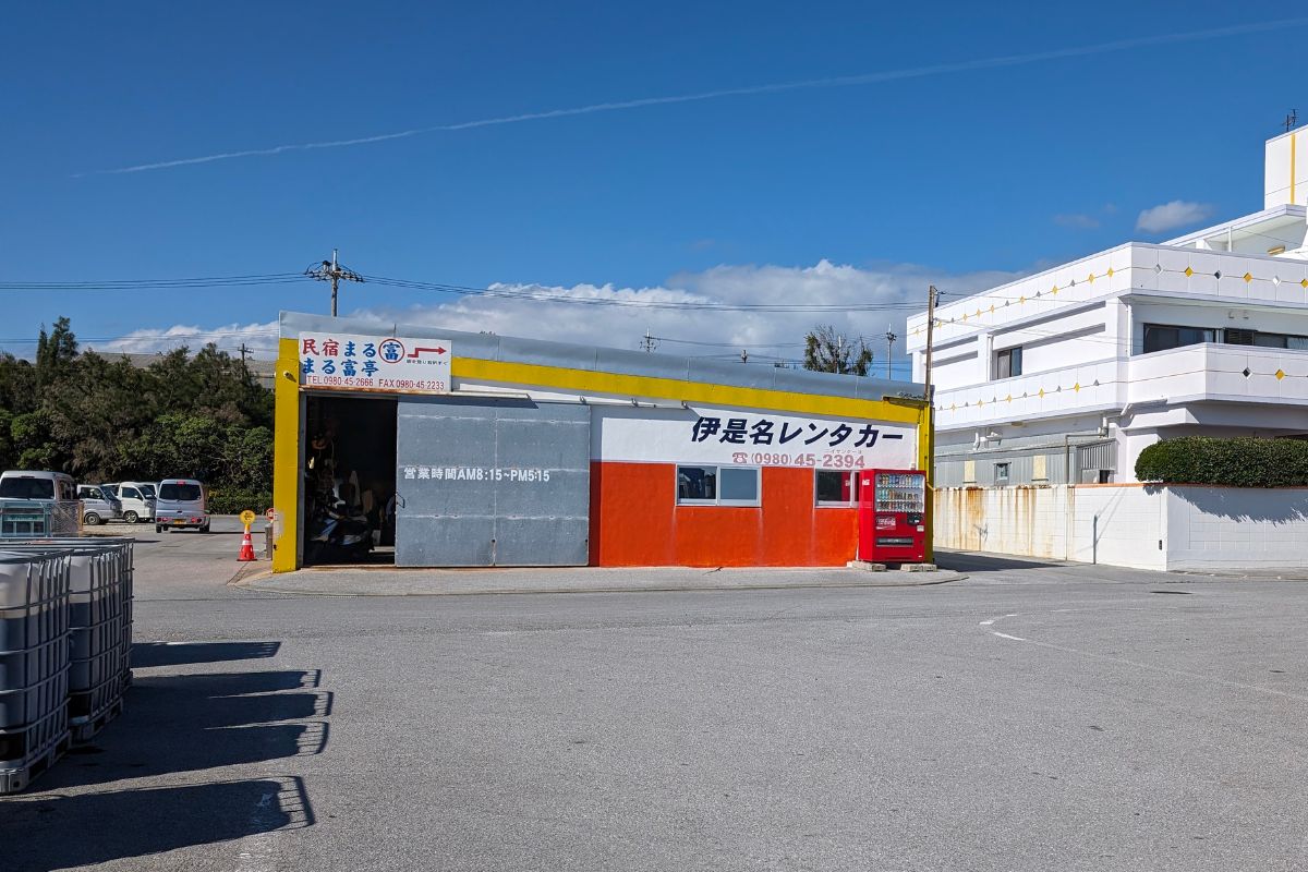 伊是名島で旅行者が使える交通手段には、レンタカーと原付・レンタサイクルがあります。個人的におススメなのは圧倒的にレンタカー。実際に走ってみてわかったのですが、伊是名島は起伏が多い地形で、道路には日よけなどはありません。健脚で日焼けが気にならない方以外はレンタカーにした方が無難です。 港のすぐ近くにある「伊是名レンタカー」が島の唯一のレンタカー屋さん。カラフルな配色ですぐにわかります。事前に予約しておくと受け渡しがスムーズですよ。