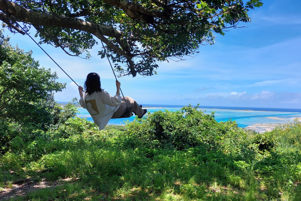 さらに、陸ギタラのふもとには、海に向かってブランコが設置されているんです!緑に囲まれ、伊是名ブルーの海を眼下に漕ぐブランコ。最高の気分が味わえますよ。