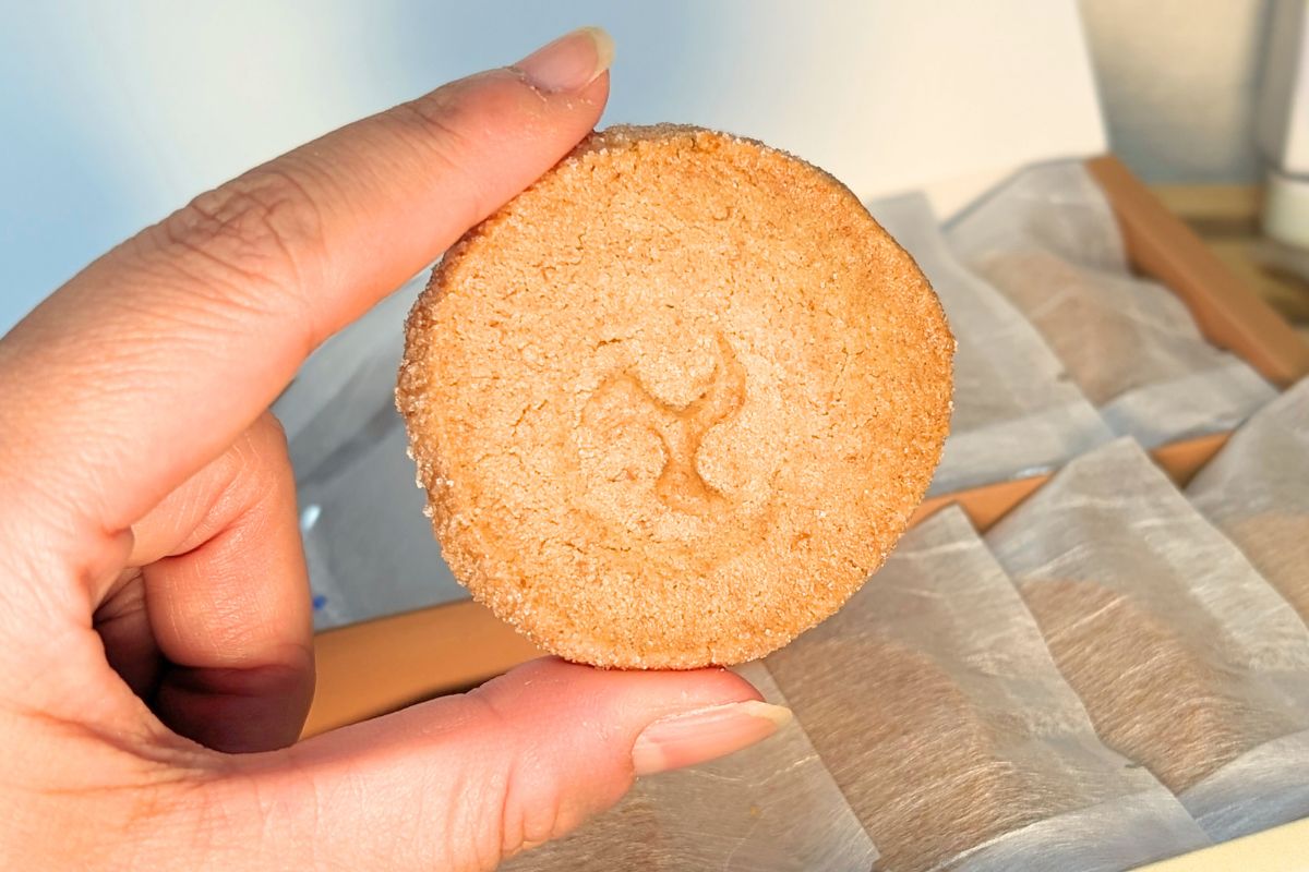 今回購入したのはこちらの3品。「菓子の島 かみやま」のクッキーには、尚家の紋である「左三つ巴」が刻印されています。味は、ショートブレッドのような密度の高いサクサク感があり、力強い小麦の風味がしっかり。