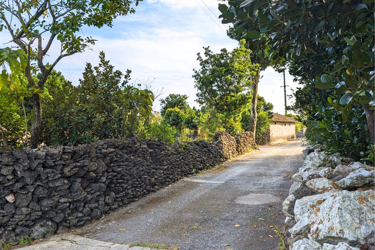 銘苅家住宅付近の伊是名集落には、昔ながらの沖縄の風景が残されています。特にフクギ並木とサンゴの石垣は風情があって、ゆったりとその辺を散歩したくなるはず。 こういう石垣はハブの住処になるため、戦後はどんどんコンクリートに置き換わりましたが、伊是名島にはハブがいないので、今でもずっと残されているそうです。