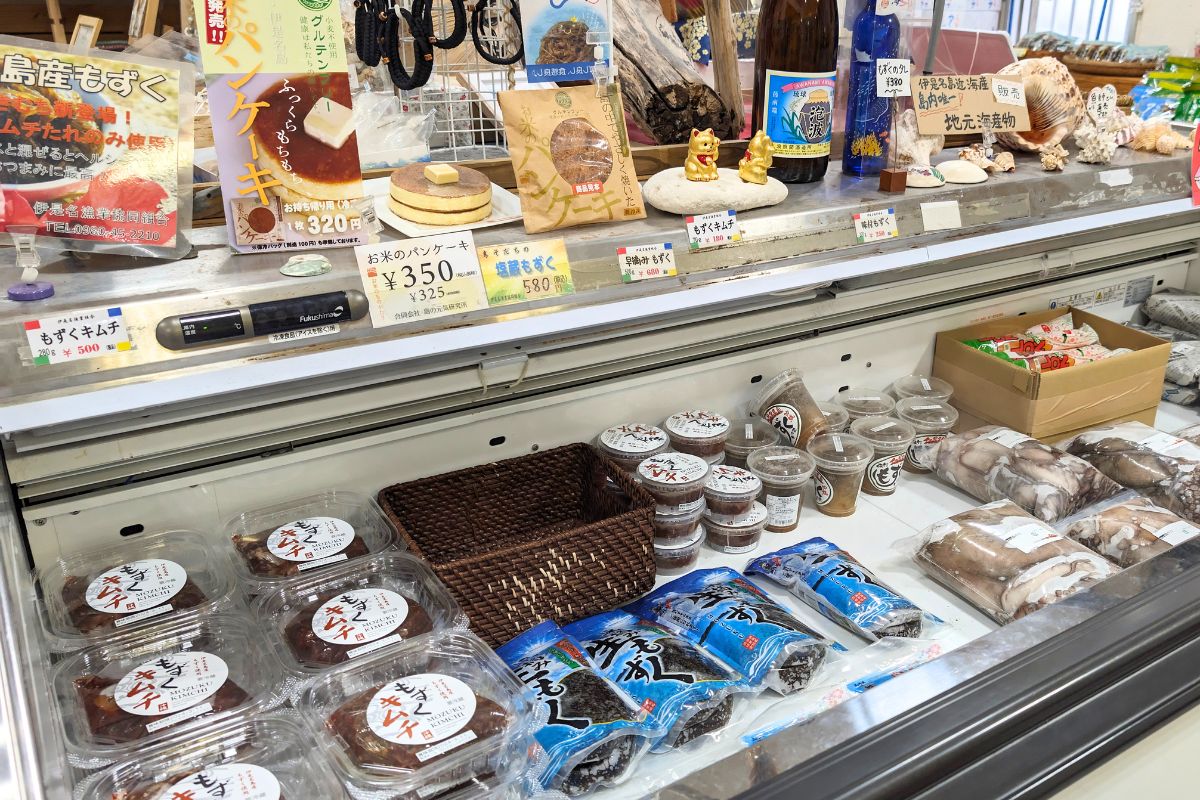 お土産の定番は、泡盛やモズク。また、稲作が行われているので、お米そのものも実は人気が高い商品。米粉を使った太陽食堂の麺やマカロニも気になります。