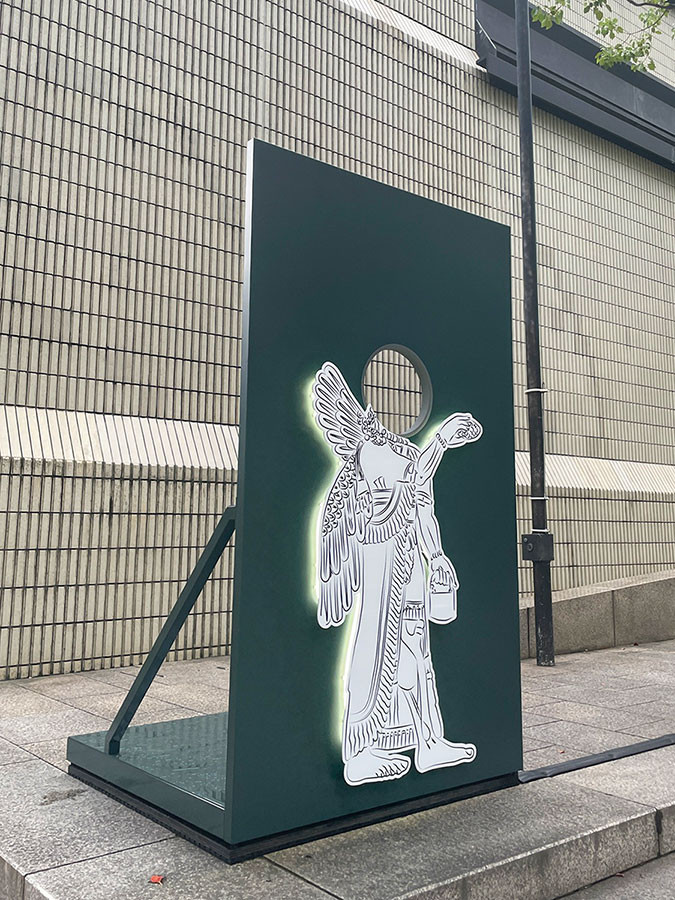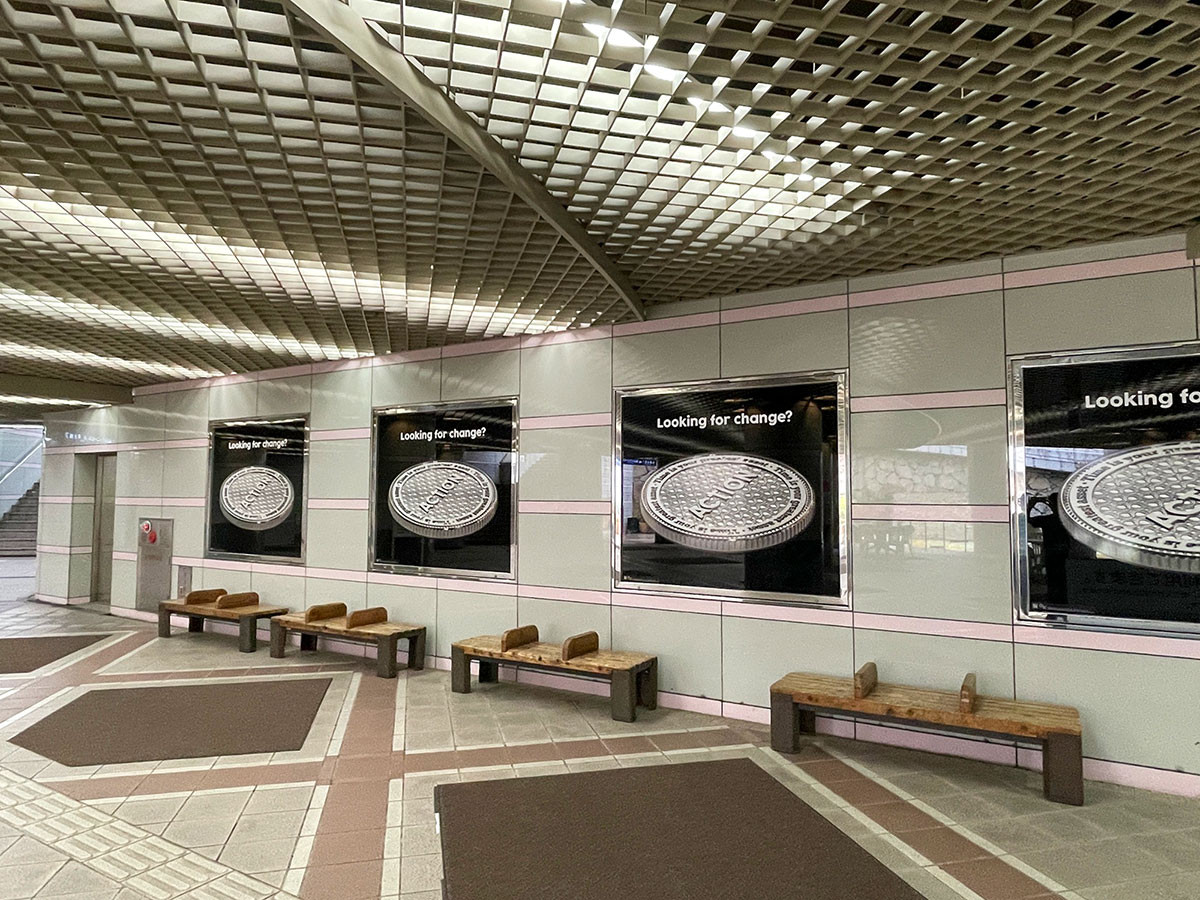 鑑賞者は偶然に出会ったそれを持ち帰ることができます。また岡山天満屋、城下地下広場など、街中に貼られたティーザー広告のポスターやバナーには、コインのイメージがあしらわれ、展覧会と都市空間との融合を感じさせます。ぜひ「公園」をめぐりながらコインを探してみてください。