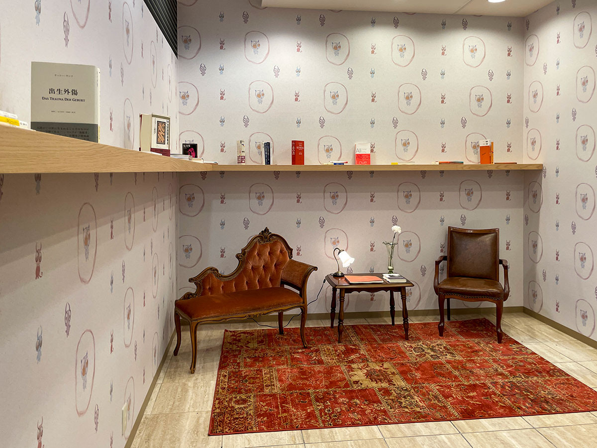 前回、旧内山下小学校のプールに登場した巨大なくまのぬいぐるみを制作したプレシャス・オコヨモンも、今年再び参加しています。表町商店街の雷電館1階に現れた《実存探偵社(岡山)》では、週末に「実存探偵」と呼ばれる人物(オコモヨモが制作した白いガウンを着用)が来場者と対話し、夢や記憶、隠された感情について問いかけます。壁紙のパターンも、彼女のドローイングで構成されているので、そちらも注目です。