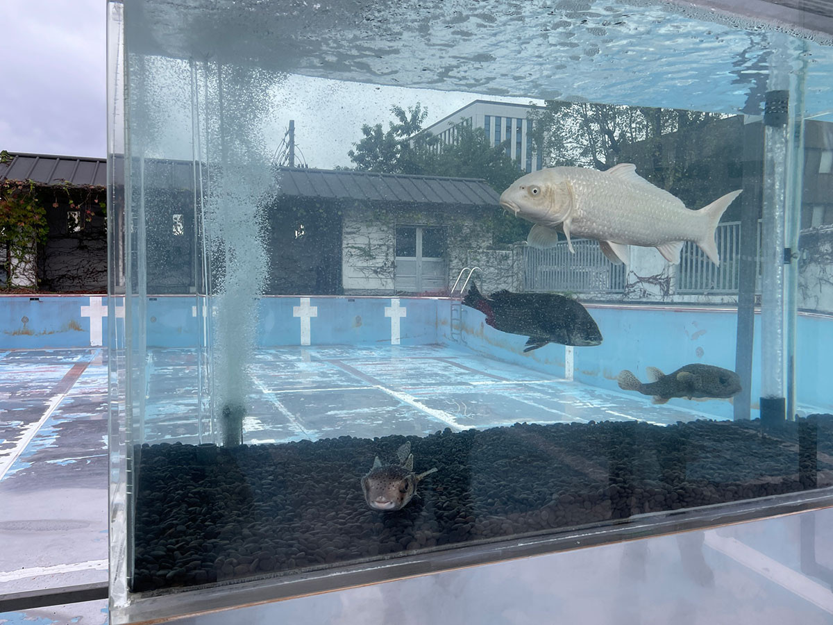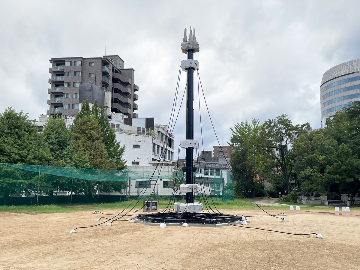 旧内山小学校の校庭にはフィリップ・パレーノの大作《メンブレン》がそびえ立ちます。コンクリート、ガラス、鉄、ケーブルでできたサイバネティック・タワーで、学習型AIとセンサー・ネットワークを搭載し、温度、湿度、風速、大気汚染など環境データを収集。その情報をもとに状況を知覚し、合理的に解釈する認知機能を備えています。