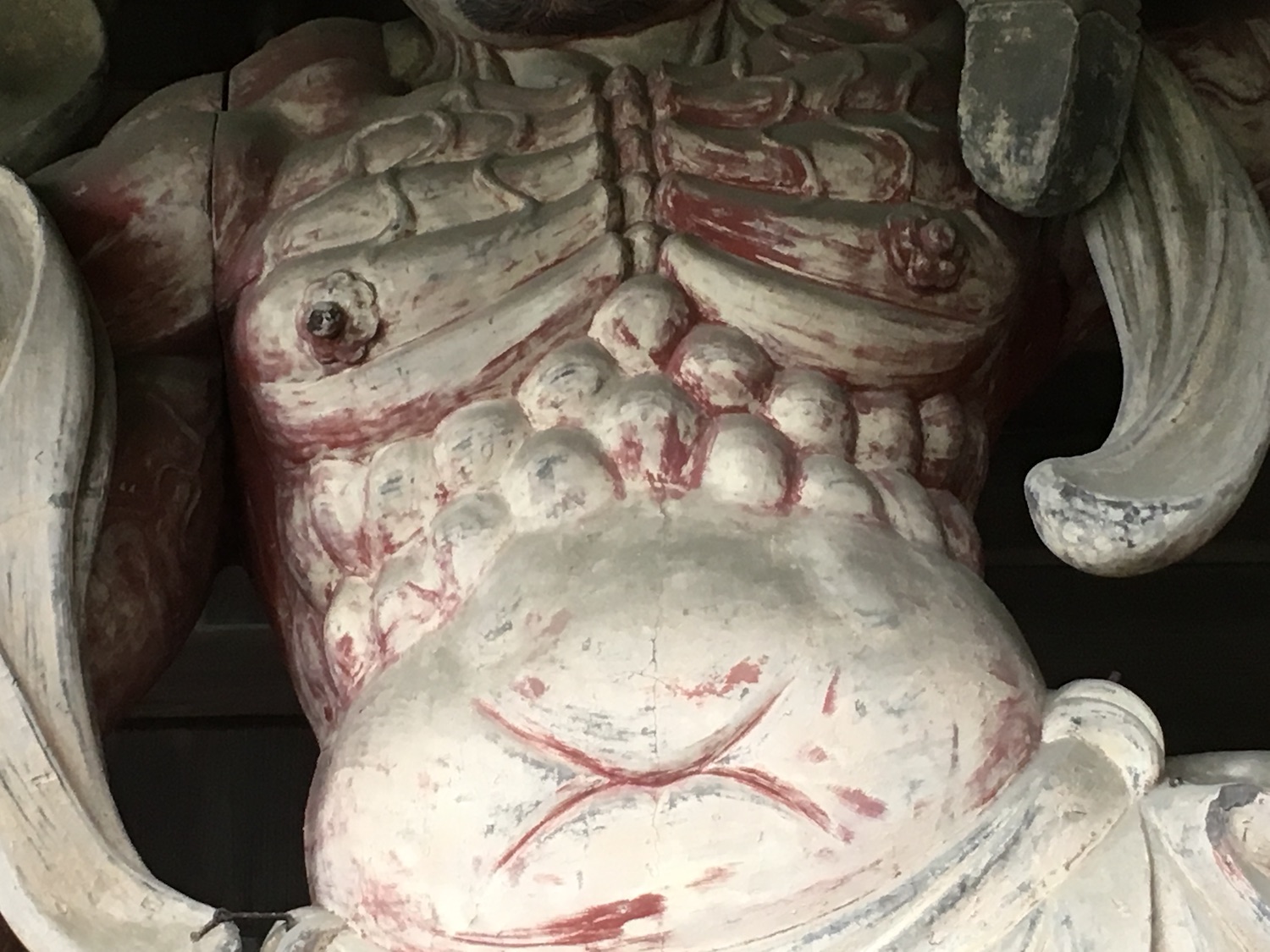 「仁王像って、古くはギリシャ神話に登場するヘラクレスという怪力の神様にも通じているとされています。だから、やはり筋肉表現はよく見てほしいですね。中でも、胸の下の肋骨あたりにブドウのようにボツボツした筋肉があります。僕はこれを“仁王筋”って呼んでいます。デフォルメに感じるかもしれませんが、ボディービルダーの方もよく見ると、ちゃんとこの筋肉があるんですよね」