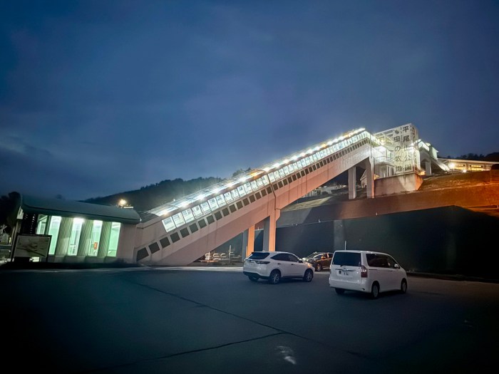 長野県佐久市の佐久平パーキングエリア。ジャンボエスカレーターがあるのは「第2PA」で、上下線どちらの佐久平PAからも利用可能とのこと。それにしてもデカい。角度と長さが異常である……!
